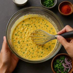 • Gradually add water and whisk to make a smooth, pourable batter (not too thick or runny).
